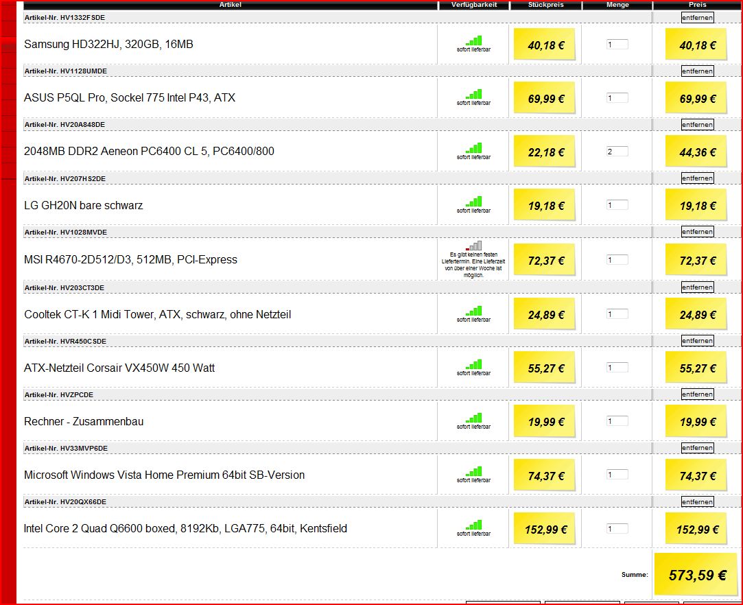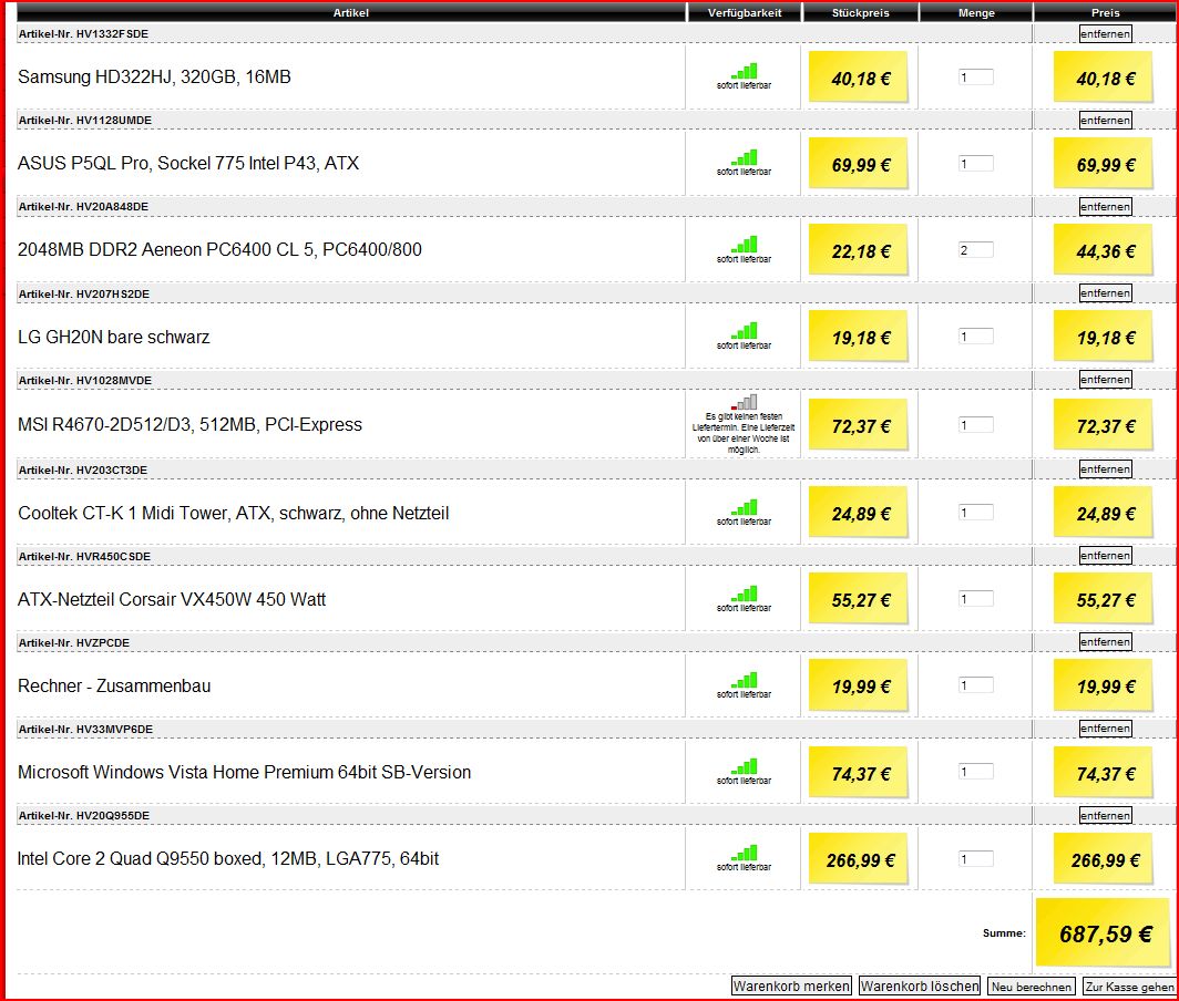Die Kosten sollten sich auf bis maximal 700 Euro belaufen. Da ich mir den Zusammenbau ehrlich gesagt nicht so wirklich zutraue bin ich darauf angewiesen per Konfigurator zu bestellen, wo auch der Zusammenbau angeboten wird. Bekannt sind mir Alternate, Hardwareversand und Mindfactory.