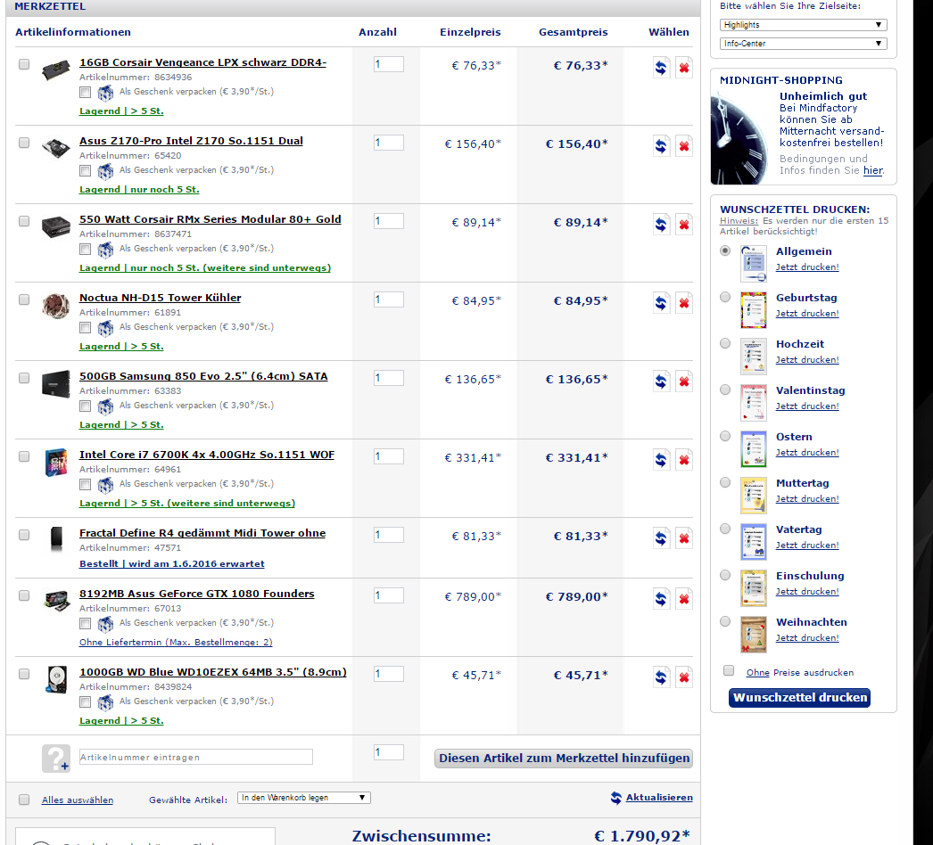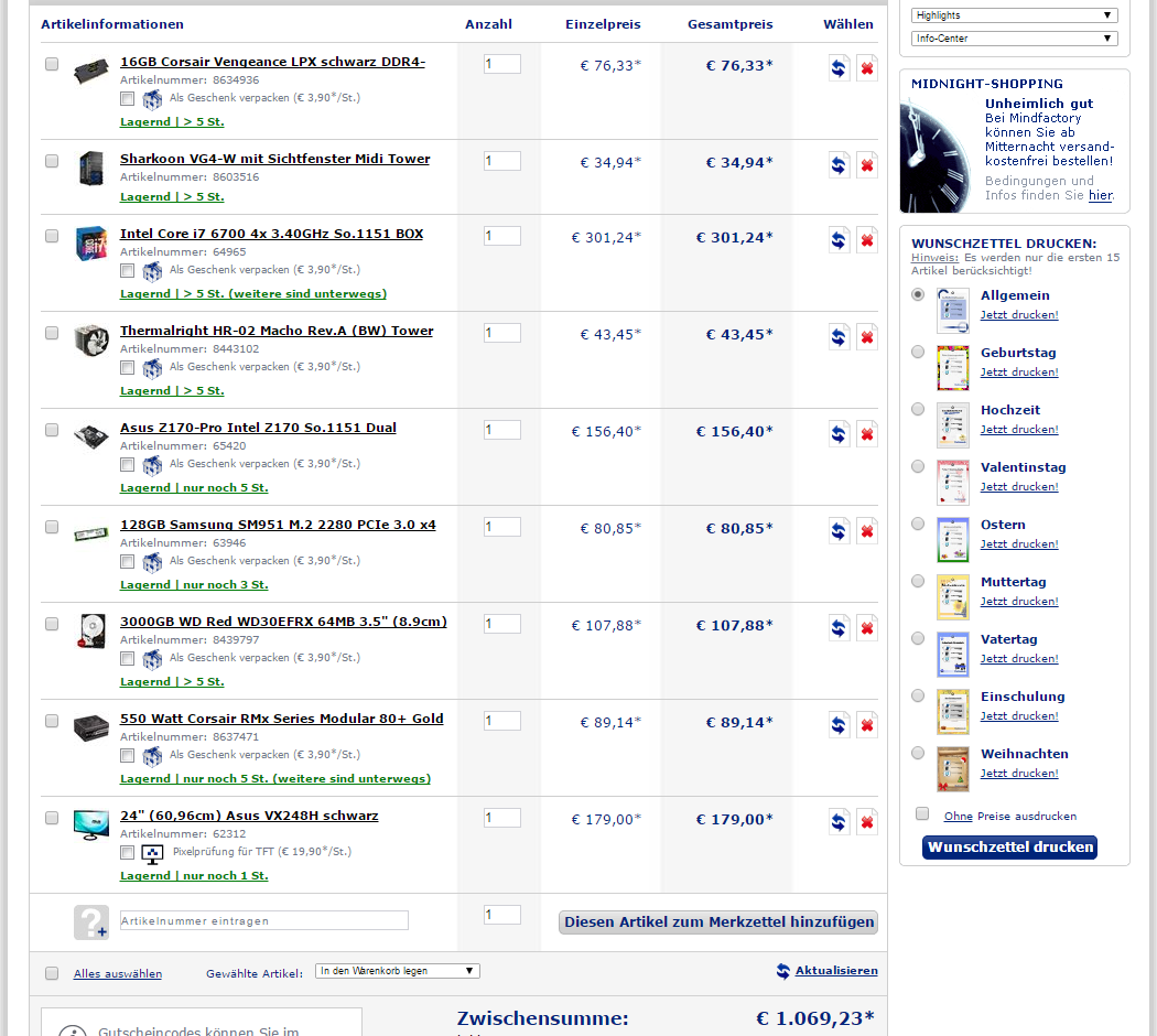 Im Titel des Threads habe ich bereits erwähnt, dass sich mein Budget so ca. auf 2000€ beläuft. Meine derzeitigen Vorstellungen sehen wie folgt aus: