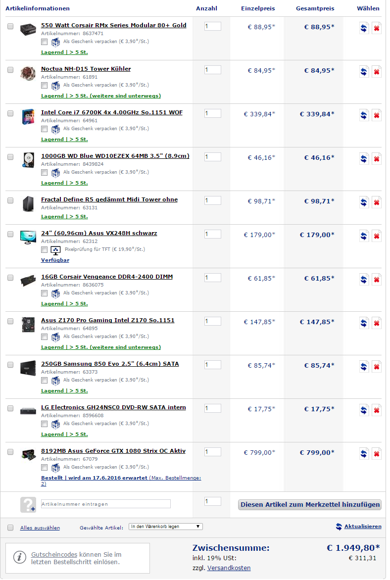 Mit diesem Setup bleibt mir noch ~50€ für die Tastatur, aber für diese entscheide ich mich erst später.