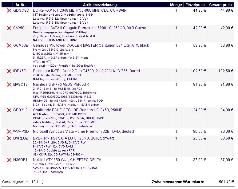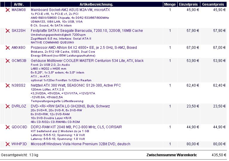 Dem kann ich mich nur anschliessen. Auch sinnvoll waer vielleicht anstatt dem E4500 einen Dualcore der E21xx Serie zu nehmen, duerfte nochmals billiger sein (zumal man die ebenfalls gut uebertakten kann). Vielleicht waer Onboardgrafik auch eine Alternative.