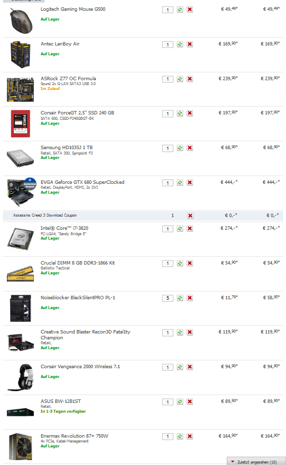 ich werd mir in 2 Monaten nen neuen PC zusammenbauen, und würd gern fragen was ihr davon haltet. Paar Tipps, ob ich besser mit Luft oder mit Wasser kühle, auch in Bezug auf das Gehäuse wären sehr hilfreich. Im Moment habe ich ein BigTower von Corsair mit WaKü und würde gerne ein wenig verkleinern. Das alles übrigens ist von alternate ausgesucht.