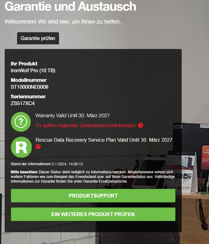 ich möchte mir gerade eine NAS zusammenstellen und habe mir naiverweise Segate Ironwolf Pro HDD's aus China bestellt, die anscheinen nicht wie angegeben "neu" waren. Das ist mir erst beim Warranty-Test aufgefallen, da nur noch 3 Jahre Restgarantie vorhanden waren.