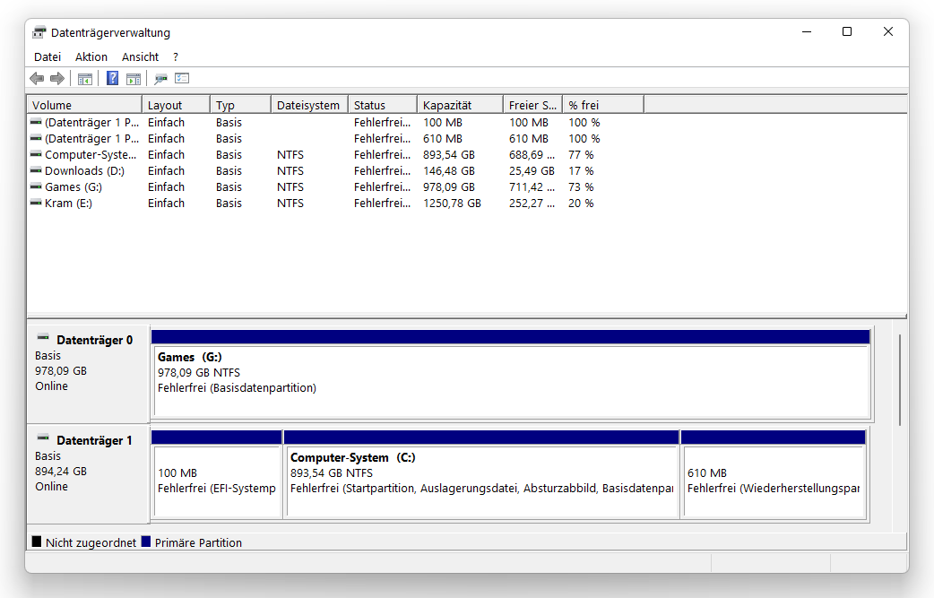 So hat Win 11 die angelegt. Heute morgen. Stick mit dem MCT erstellt. Die andere SSD war da nicht mit dran zu der Zeit.