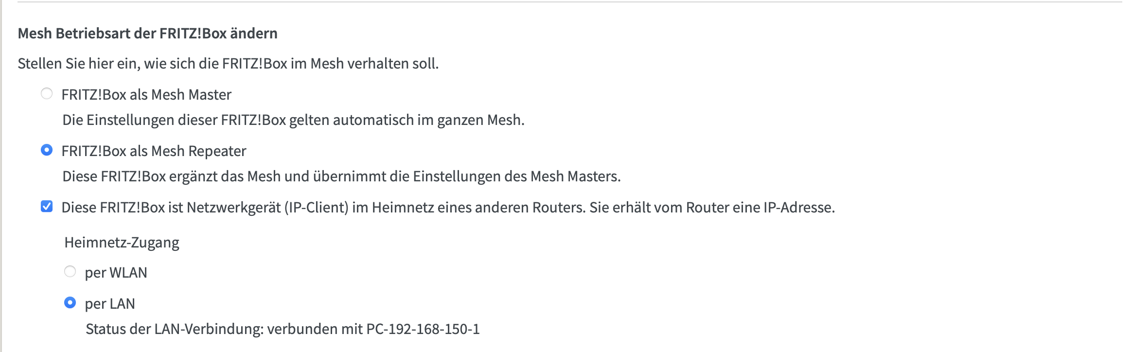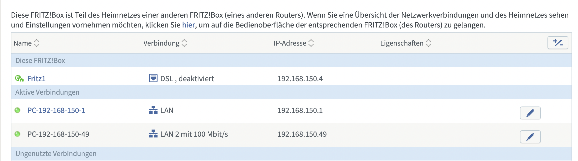 Nun hab ich aber folgendes Problem: Mein Hauptnetzwerk läuft auf dem Adressbereich 192.168.150.0/24. Die alte Fritzbox hat die Adresse 192.168.150.4 bekommen. An der alten Fritzbox hängt der Netzwerk Scanner, welcher aber nun die Adresse 192.168.178.20 bekommen hat, die alte Fritzbox hat also ein eigenes Netzwerk im Bereich 192.168.178.0/24.