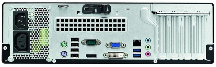 - Anschlüsse (hinten): 2 x USB 3.0, 1 x LAN (RJ45), 4 x USB 2.0, 1 x COM, 2 x PS/2, Audio in/out, 1 x LPT, DisplayPort, 1 x VGA, 1 x DVI