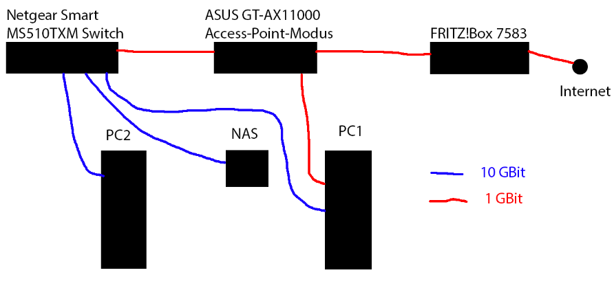 Es geht im Grunde um den PC1 und oder um den Netgear Switch. Der Netgear Switch verlangsamt mein Internet ein wenig mit dem Ping und auch die Download Geschwindigkeit. Darum habe ich den PC1 mit einem 2. Netzwerkkabel an den ASUS Router angesteckt und somit passt der Seed für das Internet, habe aber dann wieder das Problem, dass ich manchmal nicht über das 10 GBit Netzwerk Files kopiere, sondern über das 1 GBit Netzwerk.