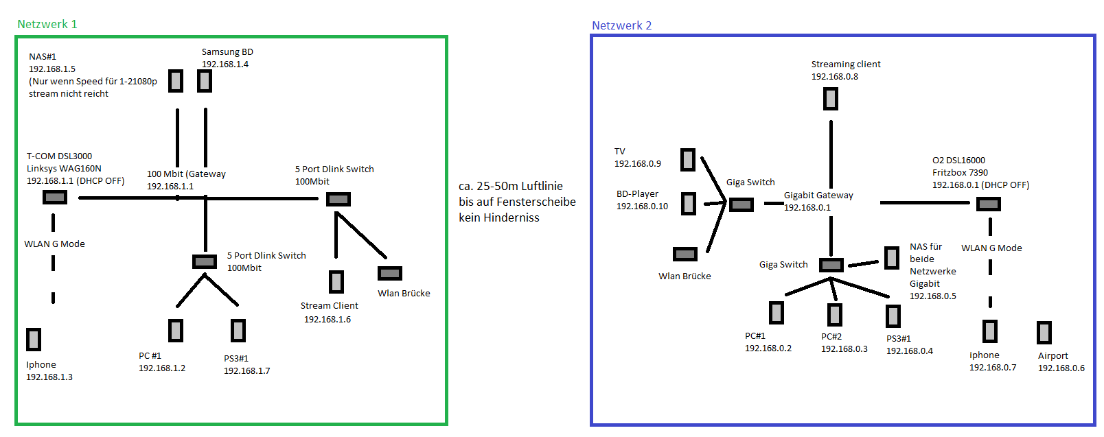 ich habe vor zwei Netzwerke mit Wlan zu verbinden. Beide Netzwerke haben einen eigenen DSL Anschluss und Router. Daher ist schon mal klar das an beiden Router DHCP abgeschaltet werden muss und jeder Client seine eigene IP und Gateway bekommt damit jeder seinen eigenen Internet Zugang nutzt. Netzwerk #1 muss im Grunde auf das NAS im Netzwerk 2 zugreifen können. Falls die Geschwindigkeit über WLAN dazu nicht ausreicht 1-3 Client mit 1080p Material zu versorgen wird das NAS von Netzwerk 2 auf das NAS im Netzwerk 1 gespiegelt.