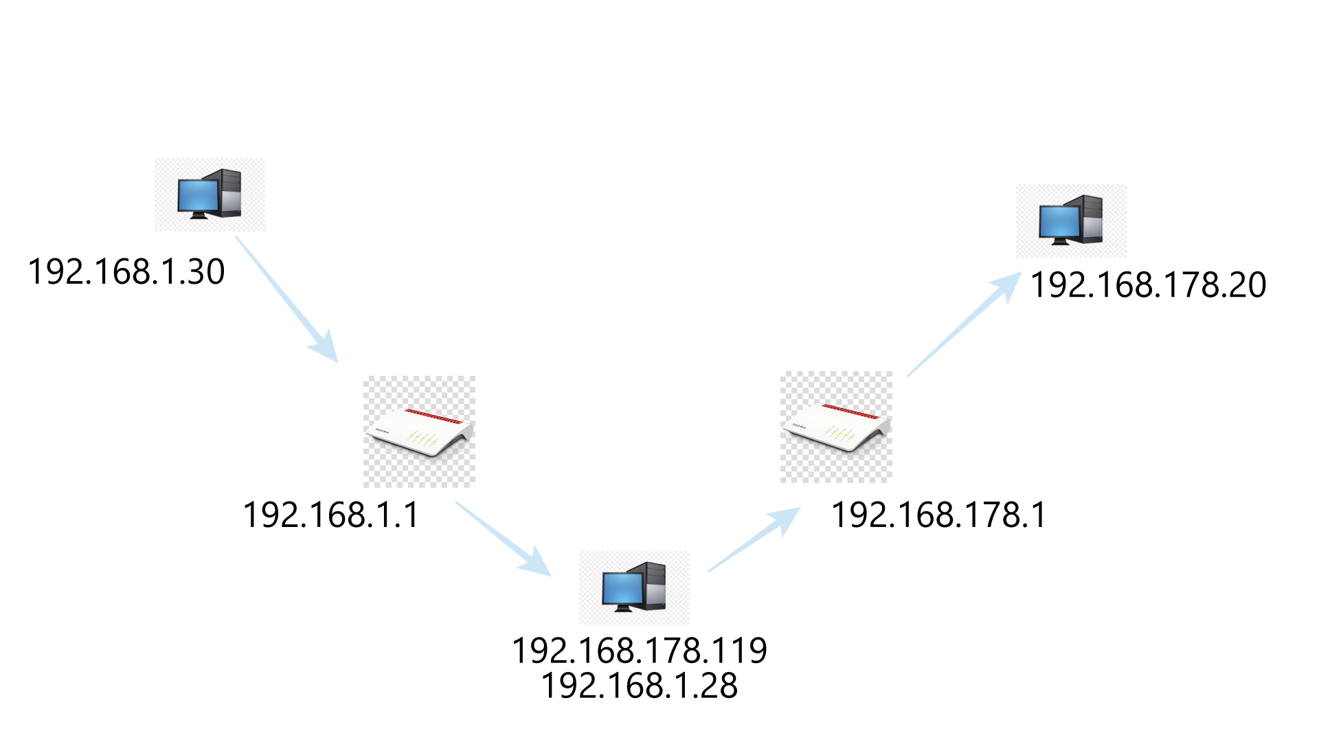 Und die anderen Pings funktionieren korrekt? Also von 192.168.1.30 auf 192.168.1.28 (und umgekehrt) und von 192.168.178.20 auf 192.168.178.119 (und umgekehrt)?