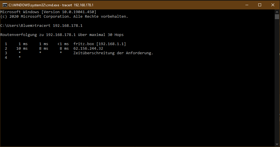 So @brainDotExe habe jetzt eine ganze zeit lang rumprobiert und bekomme es nicht hin. Habe versucht mit tracert mal nachzuverfolgen was das paket macht. Es geht von meinem Rechner in die Fritz Box und von da aus auf eine mir unbekannte ip adresse. Sprich das signal kommt nichtmal an dem Router/Server an.