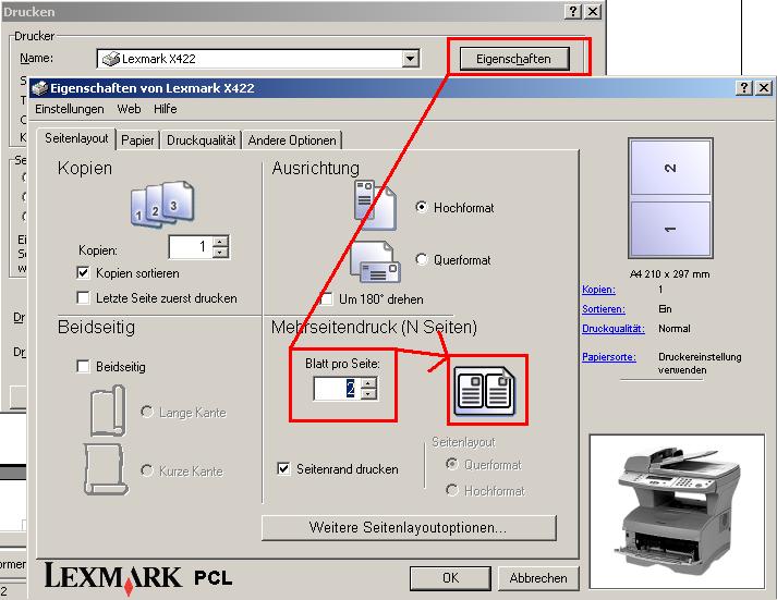 Ich habe pdf-Dateien, die ich gerne so ausdrucken würde, dass ich praktisch zwei Seiten (eigentl. DinA4) auf DinA5 verkleinern könnte und so zwei Seiten auf einer DinA4 Seite bei der Ausgabe habe.