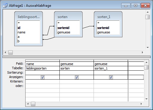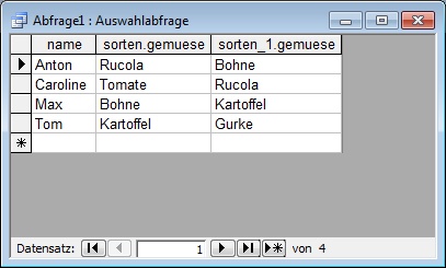 Wie bekomme ich es hin, dass beide Gemüsesorten erscheinen, ohne, dass ich eine zweite Spalte "gemuese" mit den gleichen Daten erstellen muss?