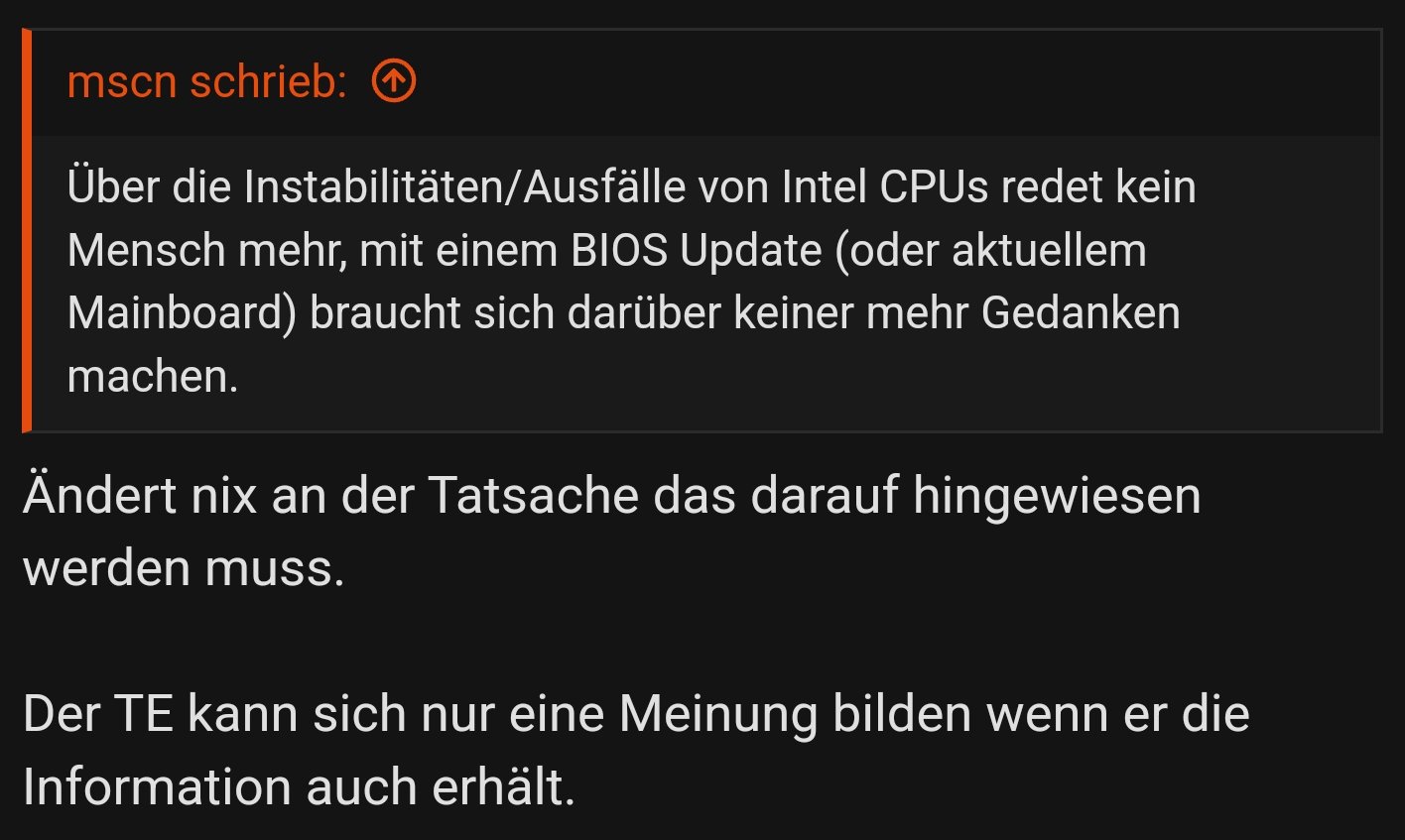 Und dann auch die Problematik mit Intel Gen 13 und 14 hinweisen nicht vergessen. Und ja man darf Alternativen aufzeigen. Würde der TE primär arbeiten wollen würde ich sagen kann man drüber nachdenken eine Intel CPU zu wählen. Aber auch da sollte immer auf Intels Probleme hingewiesen werden:Klaus_I schrieb:Möchtest du den PC für Bild-/Musik-/Videobearbeitung oder CAD nutzen? höchstens als gelegentliche Hobby-Nutzung