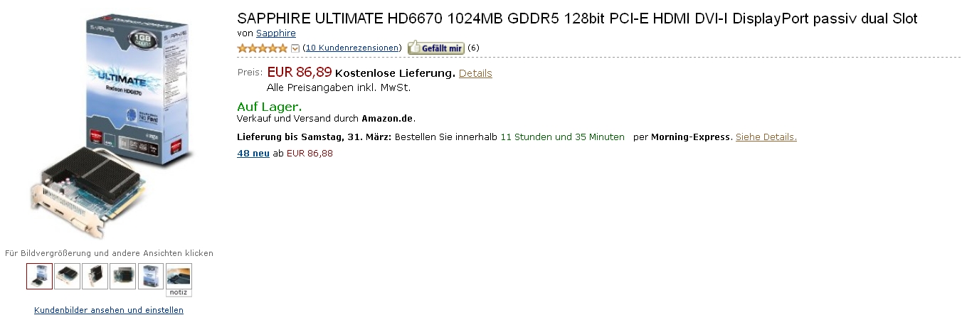 Ich habe jetzt ein bisschen gestöbert und bin auf diese passiv gekühlte Karte gestoßen, die Sapphire Ultimate HD 6670 mit GDDR5. Ich würde gern wissen, ob für die Karte ein 300-Watt Netzteil ausreicht. Die Grafikleistung würde sicherlich deutlich verbessert werden oder? Vielen Dank schonmal für eure Tipps.
