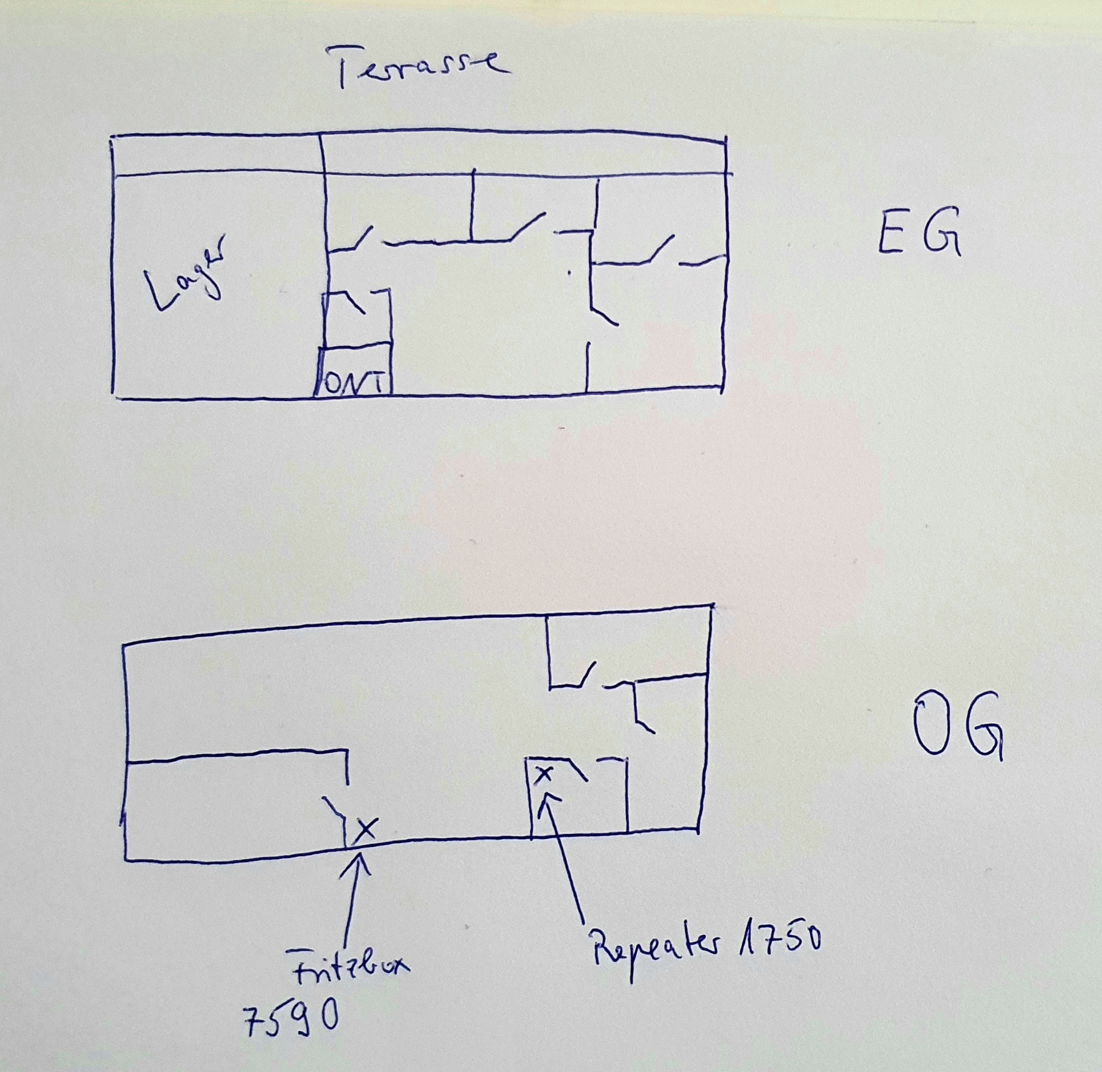 Bei dem Grundriss würde ich mit einem FRITZ!Repeater 2400 anfangen. Den oben bei Dir als WLAN-Brücke. Den FRITZ!Repeater 1750 dann unten als