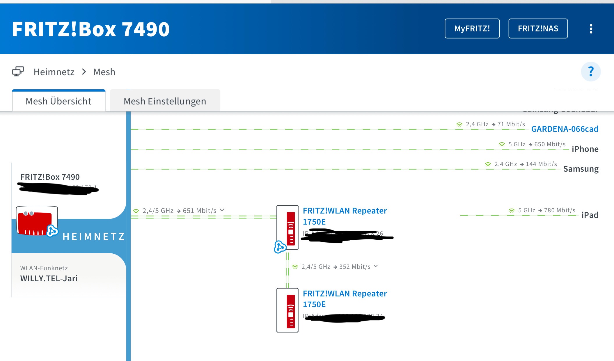 So soll es auch sein, aber der Repeater im 2.Stock ist wie auf dem Bild zu sehen nicht im Mesh Netzwerk. Neue Firmware überall vorhanden. Das Problem ist, dass ich dann versucht habe den Repeater im 2.Stock ohne Mesh über die Fritz Box direkt in das Mesh Netzwerk zu integrieren, in dem ich mit den WPS Tasten gearbeitet habe. Aber dann verbindet sich der Repeater im 2.Stock direkt mit dem Router und die Verbindung ist dann natürlich schlecht da oben. Es soll also so bleiben wie jetzt, aber wie bekomme ich den Repeater im 2.Stock ins Mesh. Wenn ich direkt in die Benutzeroberfläche des Repeaters gehe, finde ich dort keine Einstellung für Mesh.