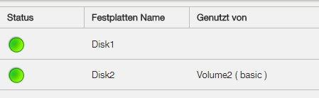 mein Zyxel NAS326 hat monatelang einwandfrei funktioniert, aufgesetzt als 1 Volume für jede der 2 HDDs. Jetzt erscheint eines der zwei Volumes plötzlich einfach nicht mehr, d.h. lässt sich auch nicht mehr zugreifen. Beide Festplatten scheinen jedoch zu funktionieren (siehe Screenshot). Hat mir jemand einen Tipp, wie ich das (ohne Datenverlust) beheben kann?