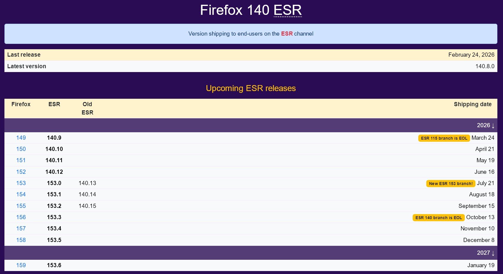 Neben Firefox 148 hat Mozilla auch die ESR-Versionen mit verlängertem Support aktualisiert, wobei Version 140.8 ESR die aktuelle Iteration darstellt. Diese bringt wie üblich keine neuen Funktionen mit sich, sondern ausschließlich Sicherheitspatches. Auch die im Grunde nur noch für Nutzer von Windows 7 bis Windows 8.1 sowie macOS 10.12 bis 10.14 gepflegte Version 115 ESR hat ein weiteres Update erhalten. Im September des vergangenen Jahres hatte Mozilla angekündigt, die ESR-Variante noch bis zum 24. März dieses Jahres mit Aktualisierungen zu versorgen. Laut der nun überarbeiteten Übersicht scheint es bei diesem Termin zu bleiben. Ob es Mozilla dieses Mal dann auch ernst meint, bleibt abzuwarten.