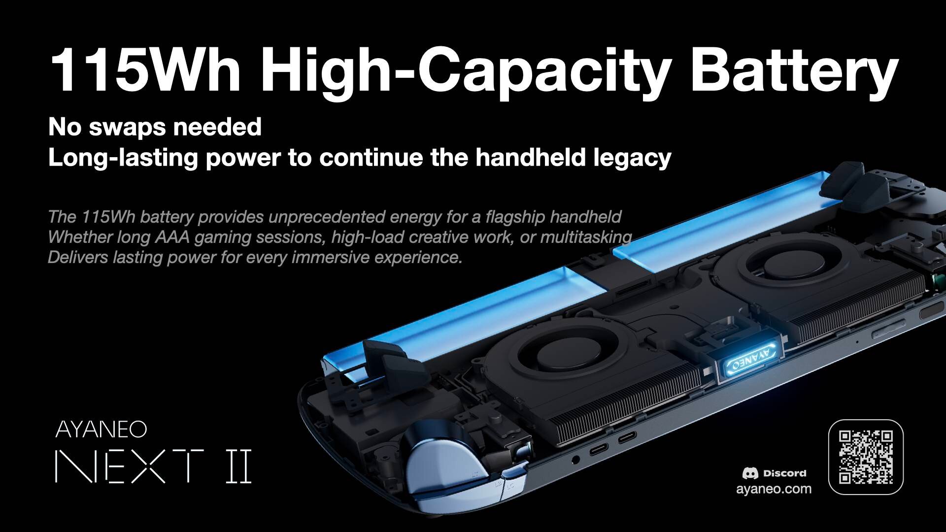 Um lange Spielzeiten unter Berücksichtigung der bis zu 85 Watt TDP zu gewährleisten, kommt ein mit 115 Wh besonders großer Energiespeicher zum Einsatz. Ohne Berücksichtigung der anderen Komponenten wäre damit bei voller Auslastung der APU eine Laufzeit von anderthalb Stunden möglich. Ayaneo selbst macht noch keine Angaben zur Laufzeit des Next II.