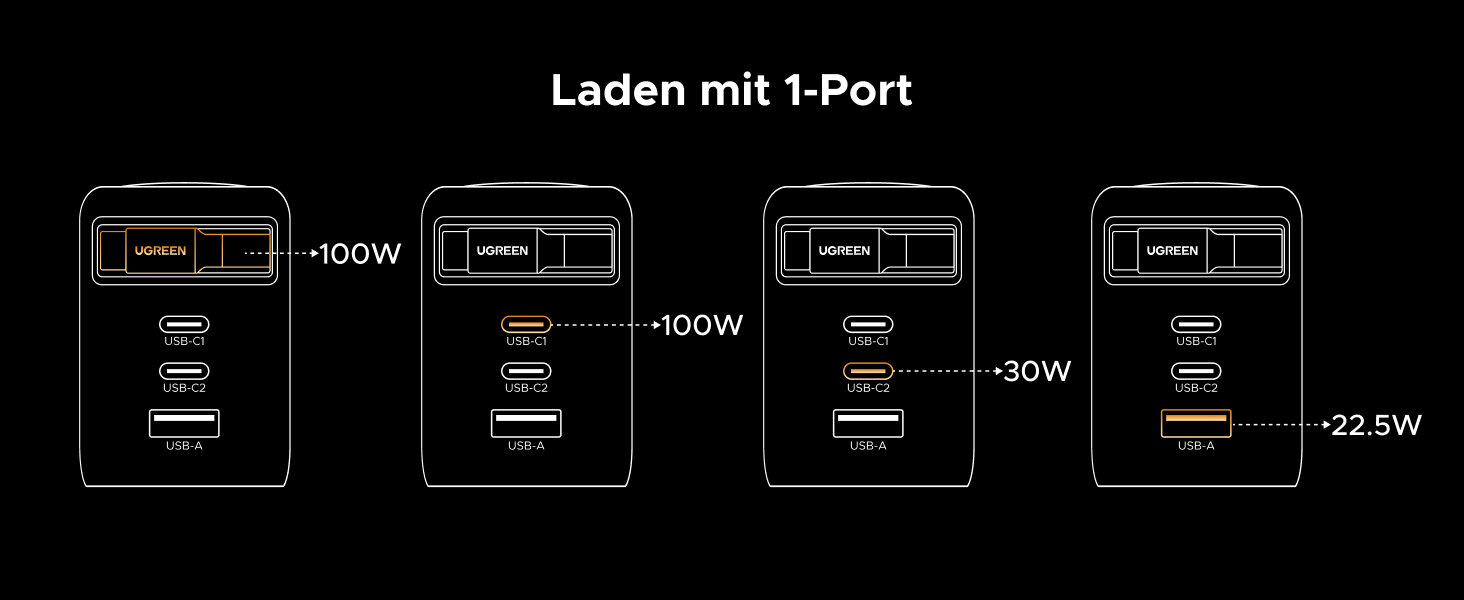 Über das integrierte 70-cm-USB-C-Kabel können bis zu 100 Watt, über den ersten USB-C-Port ebenfalls bis zu 100 Watt, über den zweiten USB-C-Port bis zu 30 Watt und über den USB-A-Port bis zu 22,5 Watt an Ladeleistung abgegeben werden. Notebook, Smartphone, Tablet und Kopfhörer parallel laden? Kein Problem!